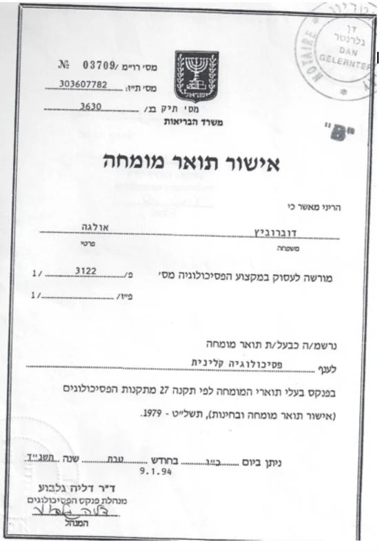 Ольга Добрович — ведущий клинический психолог клиники IsraClinic, психотерапевт с 1994 года. Клинический опыт более 32 лет. Специалист по клинической психологии Министерства здравоохранения Израиля с 1994 года. Более 15 лет в IsraClinic. Специализируется на индивидуальной психотерапии с использованием когнитивно-поведенческих методик и психодинамической диагностике. Номер лицензии клинического психолога 03709.
