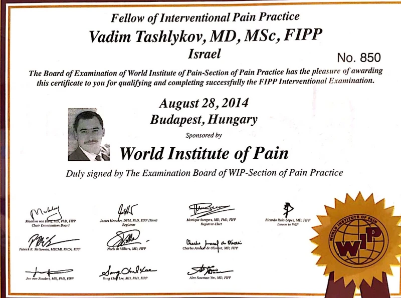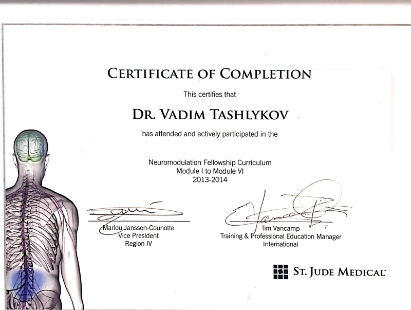 Доктор Вадим Ташлыков прошел специализацию в области функциональной нейрохирургии (нейромодуляции) в институте Передовых Медицинских Технологий Сейнт Джуд в Брюсселе (Бельгия). Также Доктор Вадим прошёл аттестацию Мирового Института Боли (WIP), получил звание ассоциата интервенционной практики боли (FIPP).