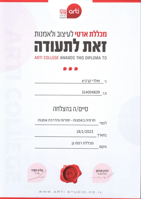 2021 - 2023 - арт-терапия, академия "Арти", колледж Рамат Ган, Израиль.